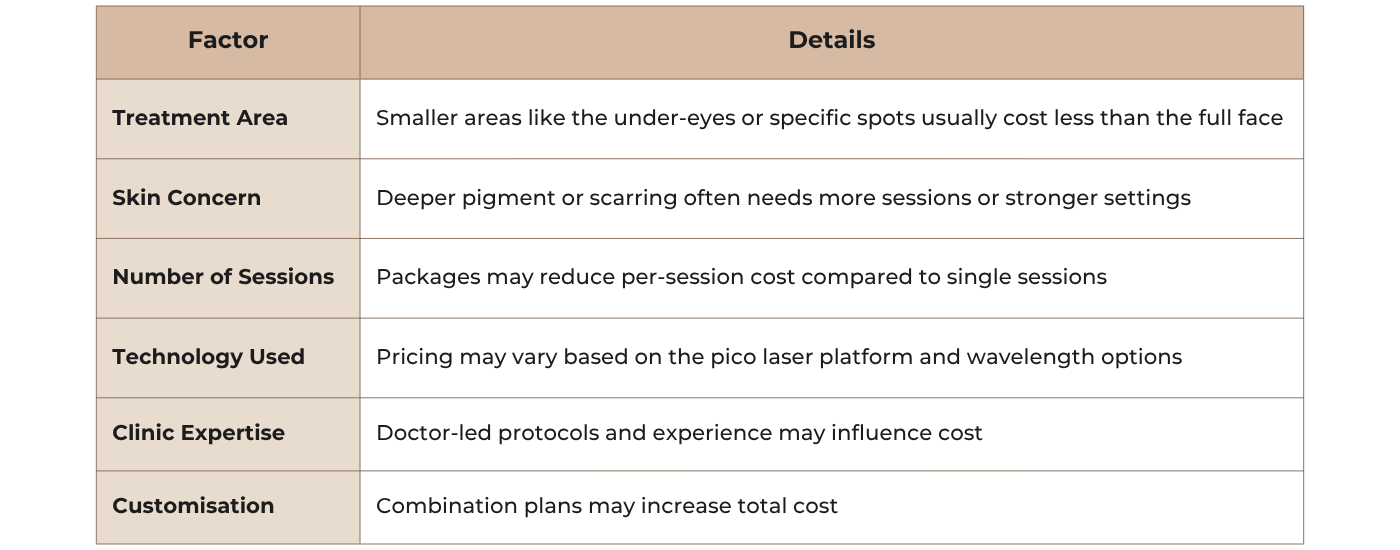The price of a pico laser treatment in Singapore can range from around $150 to $800, depending on the factors below.